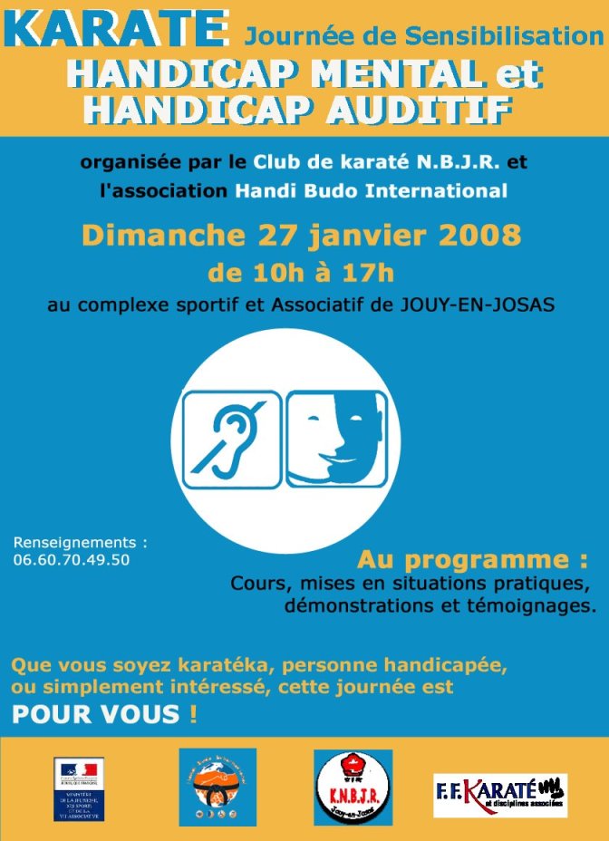 Pour la seconde fois le club KNBJR de Jouy en Josas et l’association Handi Budo International organisent le dimanche 27 janvier 2008 une journée de sensibilisation à l’accueil des personnes handicapées dans les clubs d’arts martiaux.