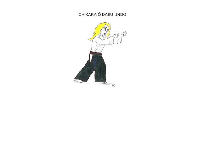 Notre pratiquante nous présente un exercice simple et caractéristique de l’extension du Ki. Chikara O Dasu (力を出す : faire sortir, extérioriser, projeter la force) est un exercice d’extension du Ki, les pieds sont tous deux bien établis dans le sol, la jambe arrière est tendue et son talon pousse le sol, on doit ressentir les muscles du mollet s’étirer (d’où, peut-être l’expression attendre quelqu’un de pied ferme et le jarret tendu). Le Ki s’extériorise via le centre jusqu’au bout et au-delà des doigts. Pour bien pratiquer cet exercice, imaginons-nous dans cette position en train de pousser un arbre. D’ailleurs, pratiquer cet exercice sur un arbre est le meilleur moyen de ressentir le flux de notre Ki, mais aussi de corriger notre position face à un alter ego (ici l’arbre) qui nous fait comprendre la différence qu’il y a entre un équilibre précaire et un équilibre stable. Maître TOHEÏ qui nous a quitté en ce 19 mai 2011, préconisait d’avoir une bonne hygiène de vie, et parmi ces conseils y figure que l’Homme ne doit pas se couper de la Nature car il en fait partie intégrante, même si un arbre n’est qu’un végétal il est lui aussi porteur ou expression de Ki, d’une certaine qualité, et au travers de cette relation Homme/ Nature via un simple arbre, il y a un échange bénéfique de Ki, de l’un vers l’autre.